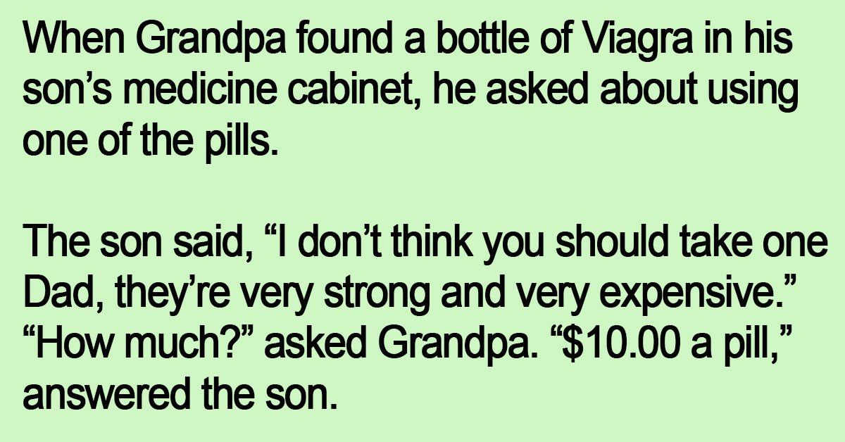 When Grandpa found a bottle of Viagra in his son’s medicine cabinet, he asked about using one of the pills.