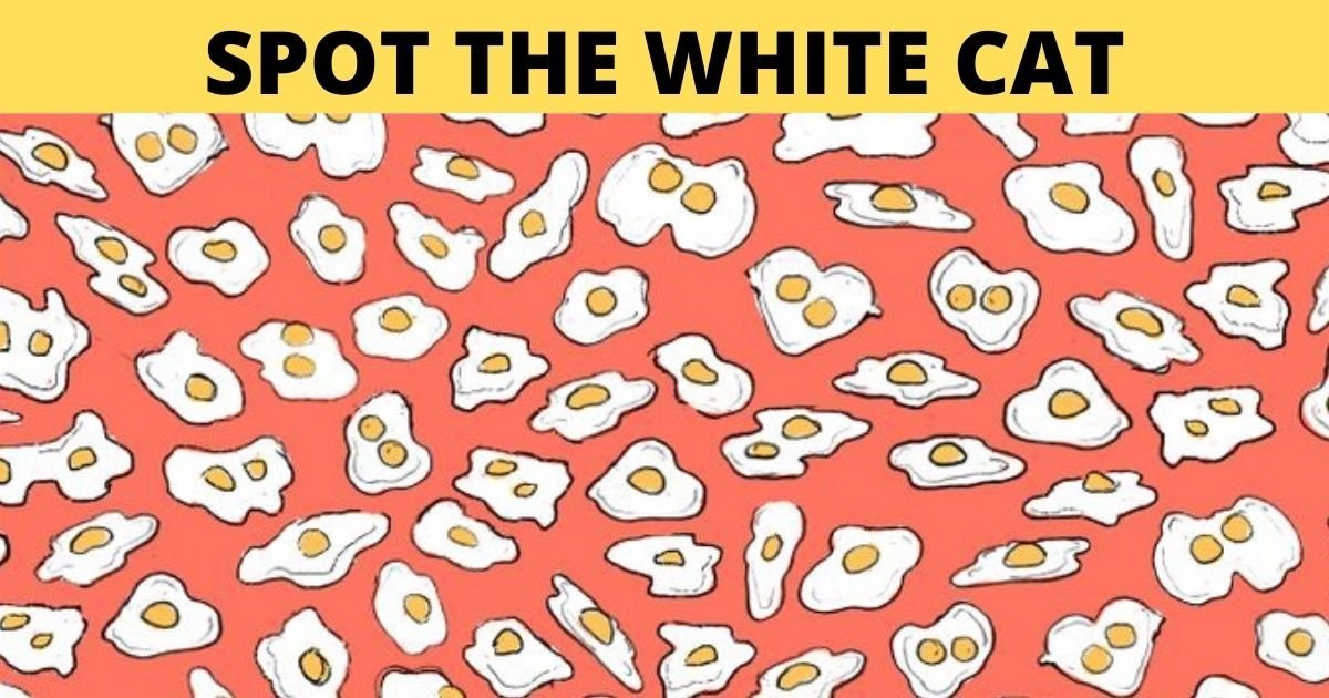 In this tricky visual puzzle, a sneaky white kitty is hiding in plain sight and is cleverly using the fried eggs to camouflage itself and blend in.
