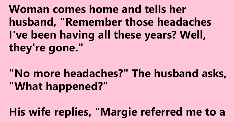 Woman comes home and tells her husband, “Remember those headaches I’ve been having all these years? Well, they’re gone.”