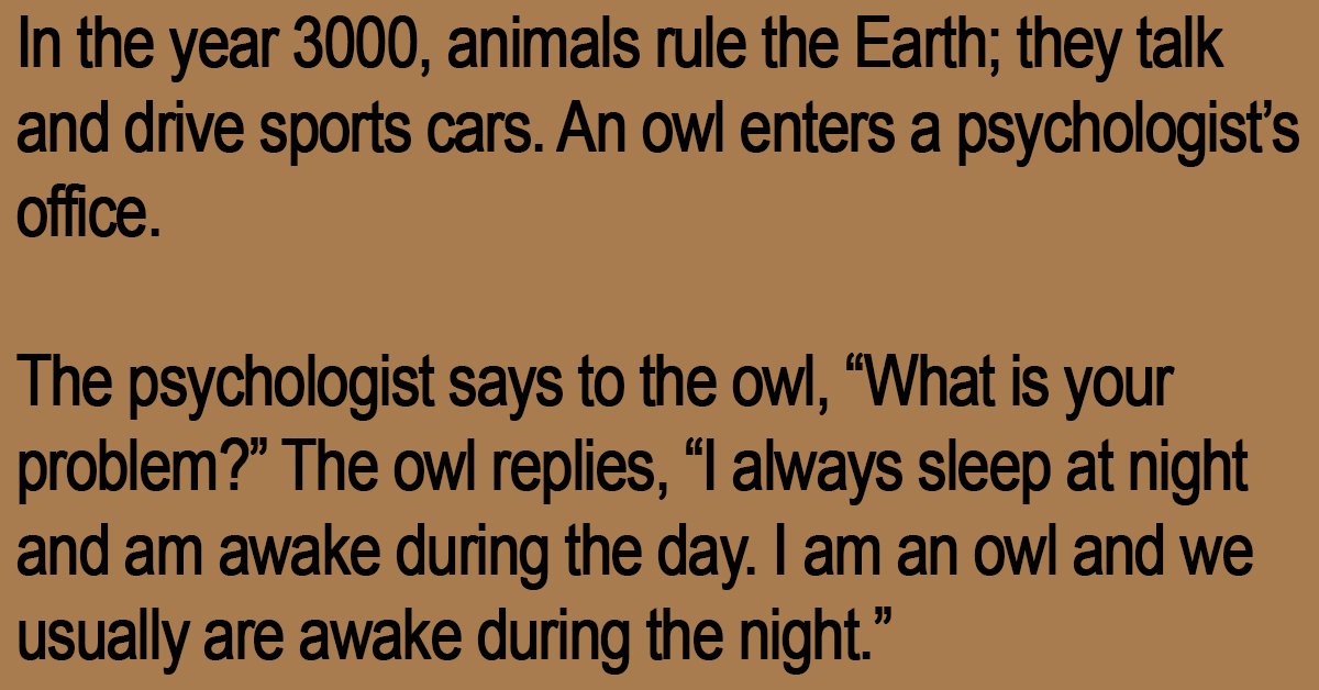 The owl replies, “I always sleep at night and am awake during the day. I am an owl and we usually are awake during the night.”
