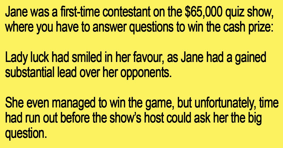 Jane was a first-time contestant on the $65,000 quiz show, where you have to answer questions to win the cash prize: