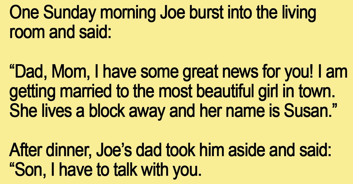 “Dad, Mom, I have some great news for you! I am getting married to the most beautiful girl in town. She lives a block away and her name is Susan.”