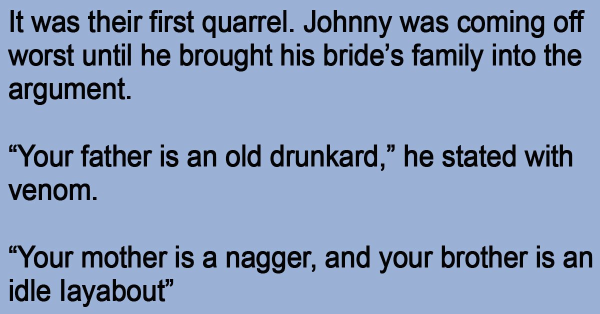 Johnny was coming off worst until he brought his bride’s family into the argument.