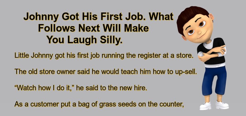 Johnny Got His First Job. – April 26, 2022 by Kevin Adams Facebook Twitter Pinterest LinkedIn Little Johnny got his first job running the register at a store. The old store owner said he would teach him how to up-sell. “Watch how I do it,” he said to the new hire. As a customer put a bag of grass seeds on the counter, the old-timer said to him, “When you plant those seeds and the grass starts growing, you’re going to need a new lawnmower to cut the grass.” “You know,” said the man, “I do need a new mower. Sure, I’ll take one.” After the customer left, Little Johnny said, “I think I see what you mean. Let me handle this next one.” A customer stepped up to the counter and set down a box of tampons. The young salesman Johnny said, “You know, you should get yourself a new lawnmower to go with that.” The man asked the young salesman Johnny, “What are you talking about?” “It looks like your weekend’s shot so you might as well cut the grass.” Facebook Twitter Pinterest LinkedIn