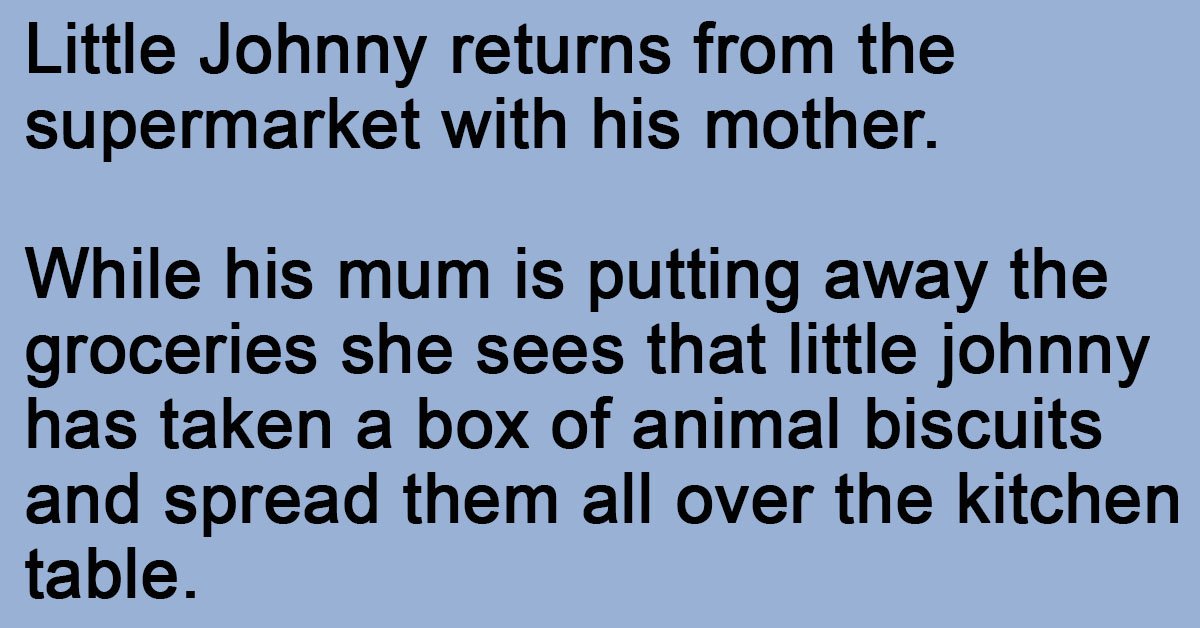While his mum is putting away the groceries she sees that little johnny has taken a box of animal biscuits and spread them all over the kitchen table.