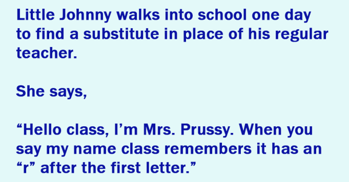 “Hello class, I’m Mrs. Prussy. When you say my name class remembers it has an “r” after the first letter.”
