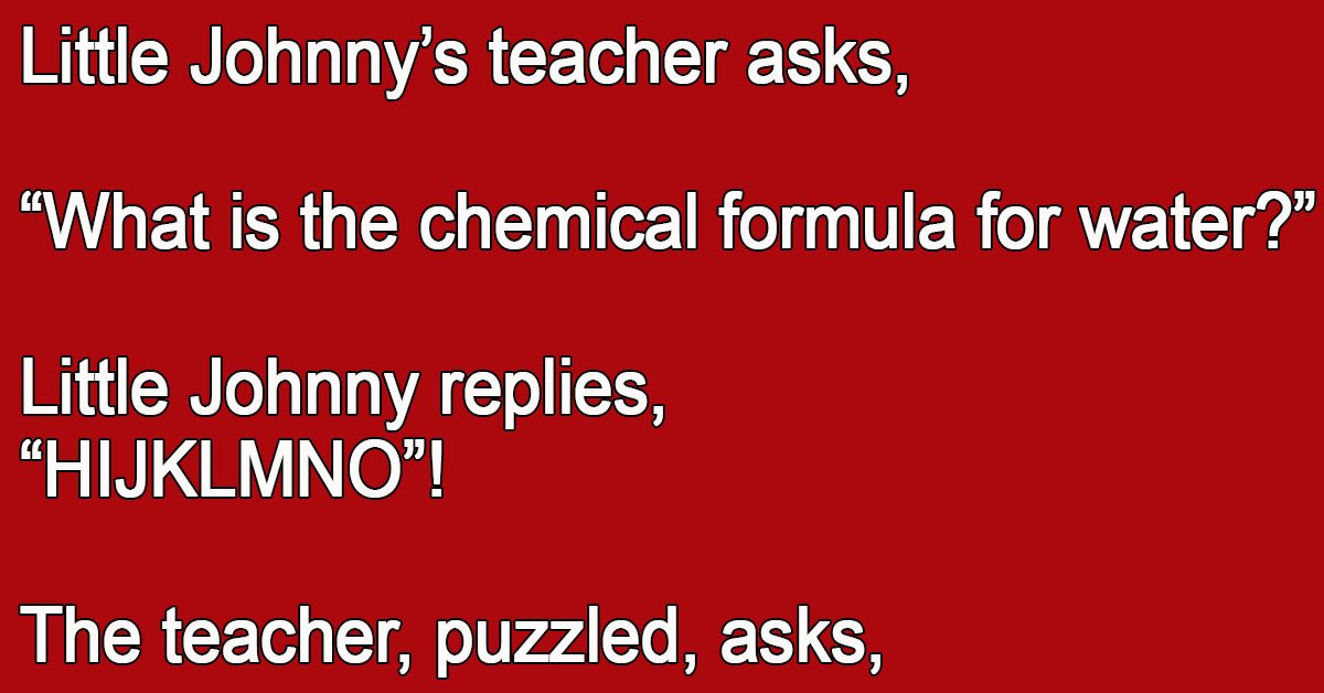 Johnny’s Humorous Take On Chemistry Class. August 16, 2023 by Kevin Adams Facebook Twitter Pinterest LinkedInLittle Johnny’s teacher asks, “What is the chemical formula for water?” Little Johnny replies, “HIJKLMNO”! The teacher, puzzled, asks, “What on Earth are you talking about?” Little Johnny replies, “Yesterday you said it was H to O!” Facebook Twitter Pinterest LinkedIn