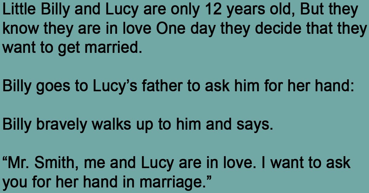 Little Billy and Lucy are only 12 years old, But they know they are in love One day they decide that they want to get married. Billy goes to Lucy’s father to ask him for her hand: