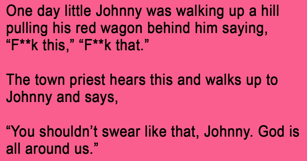 One day little Johnny was walking up a hill pulling his red wagon behind him saying, “F**k this,” “F**k that.”