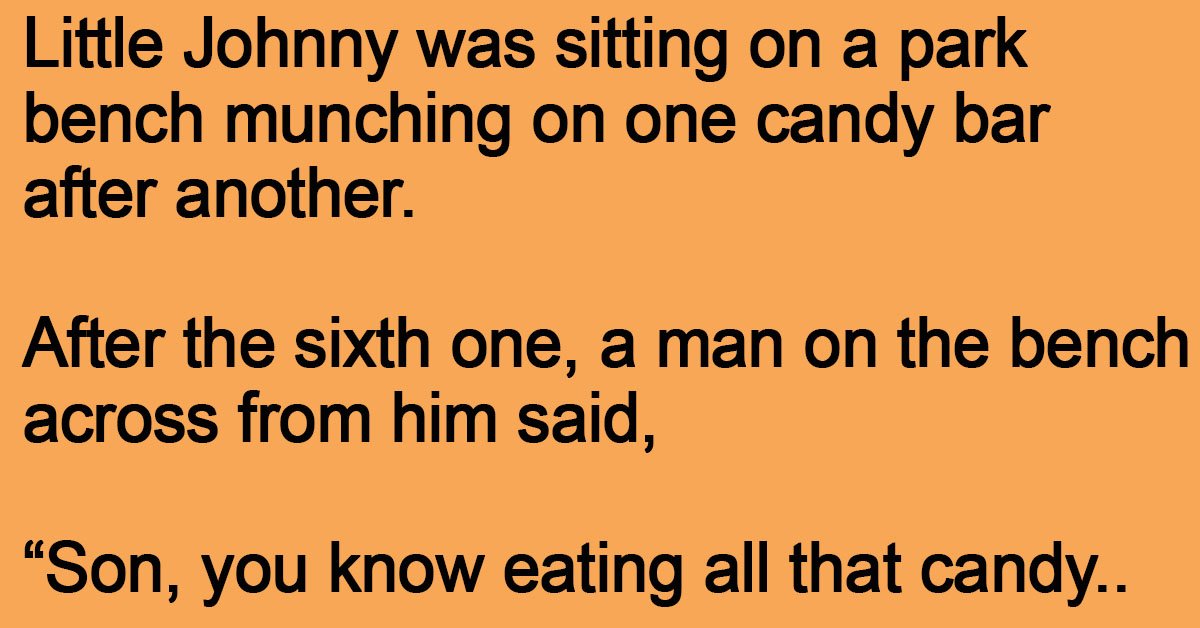 Little Johnny was sitting on a park bench munching on one candy bar after another.