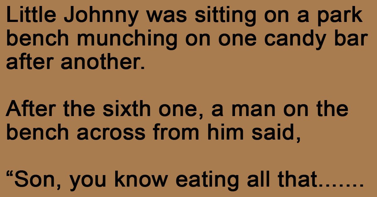 Little Johnny was sitting on a park bench munching on one candy bar after another.