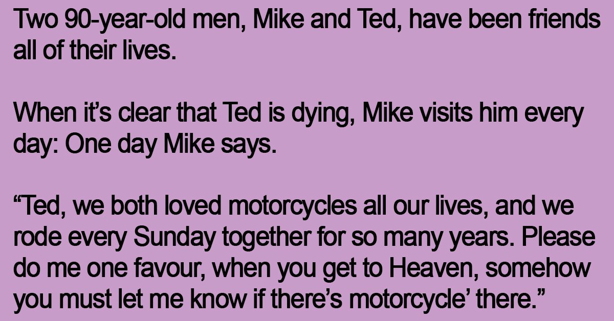 “Ted, we both loved motorcycles all our lives, and we rode every Sunday together for so many years. Please do me one favour, when you get to Heaven, somehow you must let me know if there’s motorcycle’ there.”