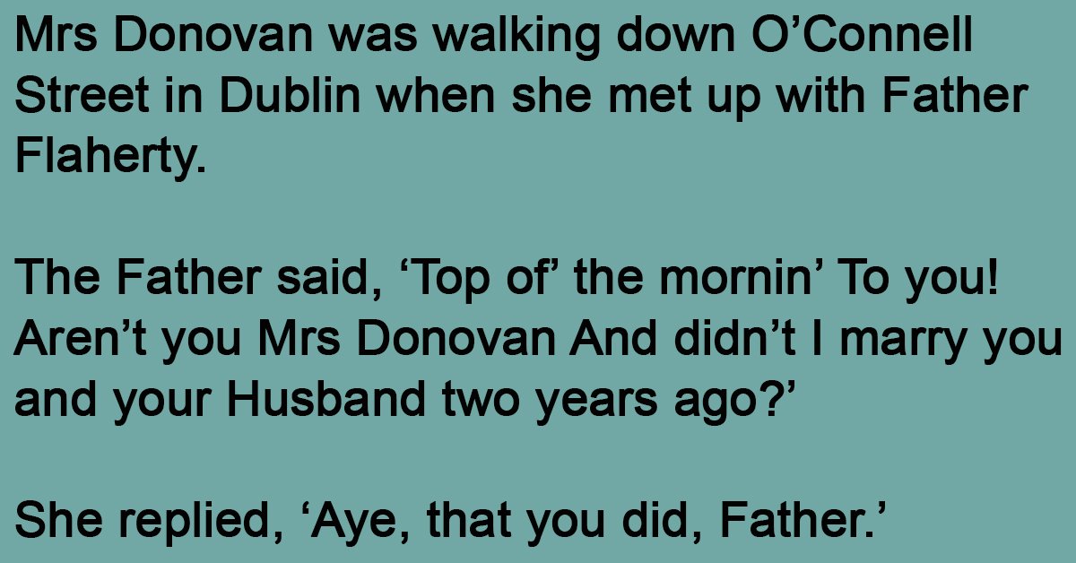 The Father said, ‘Top of’ the mornin’ To you! Aren’t you Mrs Donovan And didn’t I marry you and your Husband two years ago?’