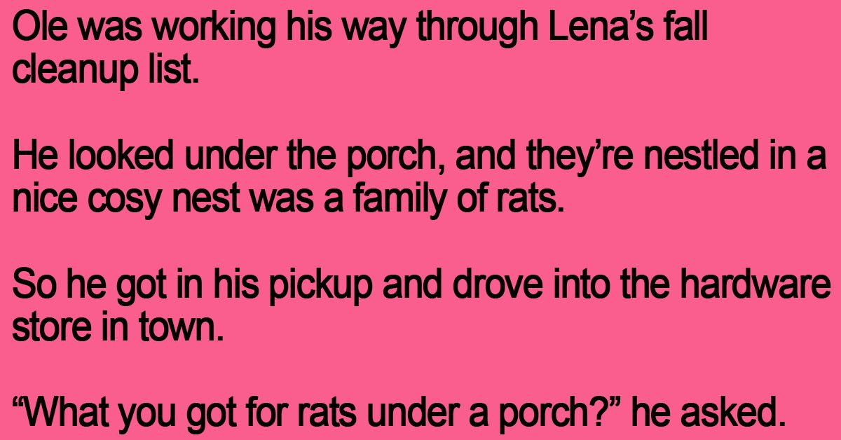 “What you need is what we in the business call the thermonuclear pest-control option. You go down to the grocery store and you get yourself some lutefisk. Have Lena cook it up with a bit of butter, some cream gravy, maybe a couple of boiled potatoes on the side. I guarantee you that the smell alone will get rid of your rats.”