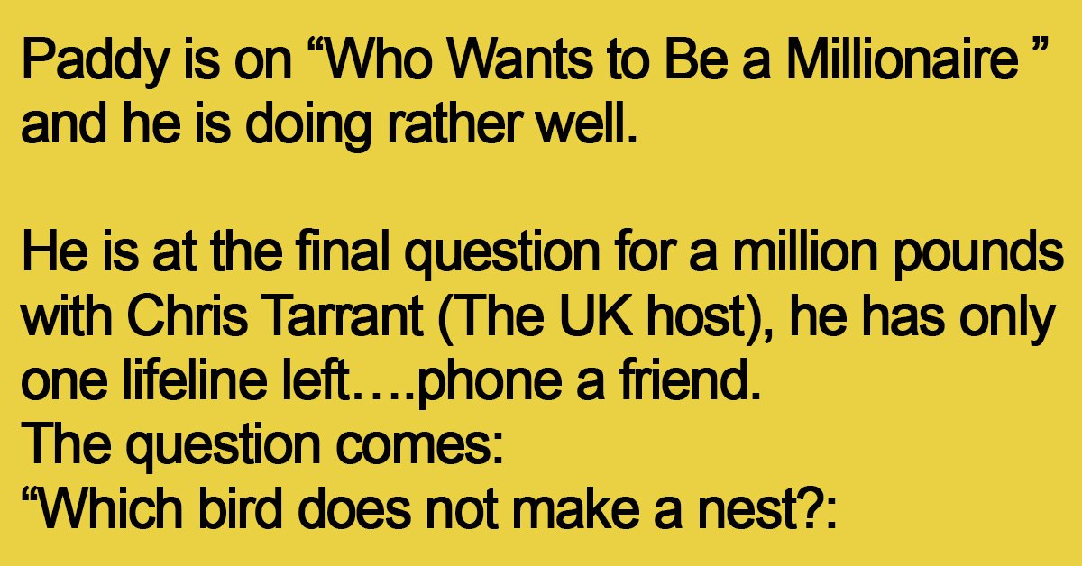 Murphy answers ‘be jesus Paddy, it’s a cuckoo 100%.’ – Paddy wins the million pounds and is very happy.