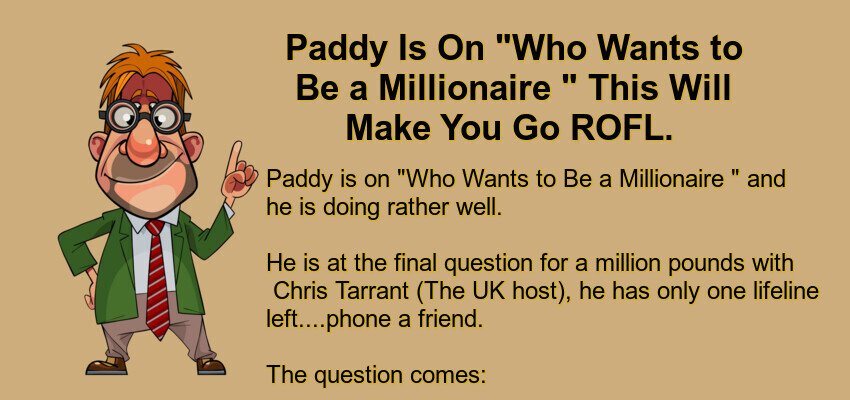 Paddy Is On “Who Wants to Be a Millionaire ” – May 16, 2022 by Kevin Adams Facebook Twitter Pinterest LinkedIn Paddy is on “Who Wants to Be a Millionaire ” and he is doing rather well. He is at the final question for a million pounds with Chris Tarrant (The UK host), he has only one lifeline left….phone a friend. The question comes: “Which bird does not make a nest?: A) a Sparrow, B) a Swallow, C) a Blackbird or D) a Cuckoo Paddy doesn’t know so he calls his friend Murphy. Murphy answers ‘be jesus Paddy, it’s a cuckoo 100%.’ – Paddy wins the million pounds and is very happy. Afterward, Paddy rings Murphy and asks him ‘How the f*ck did you know that? Murphy replies ‘ Well, Paddy yer thick git…it lives in a f*cking clock…’ Facebook Twitter Pinterest LinkedIn