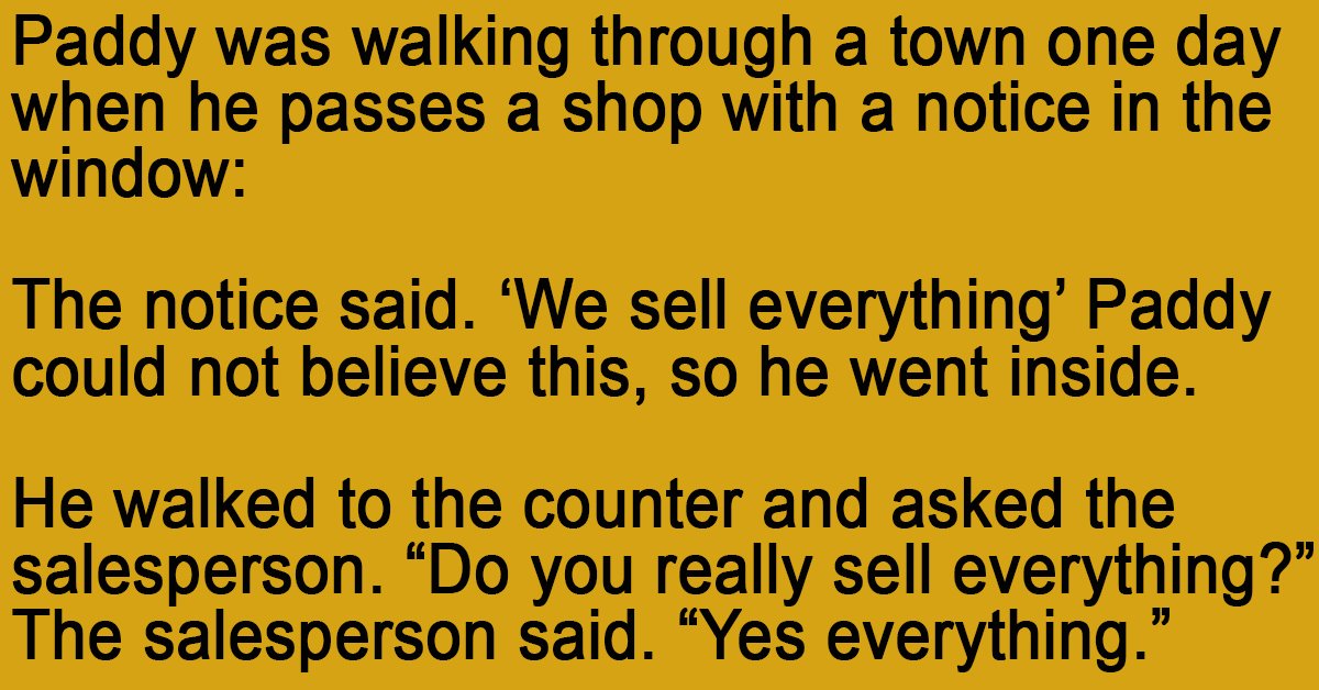 The notice said. ‘We sell everything’ Paddy could not believe this, so he went inside.