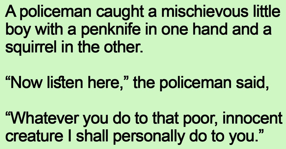 A policeman caught a mischievous little boy with a penknife in one hand and a squirrel in the other. “Now listen here,” the policeman said, “Whatever you do to that … …