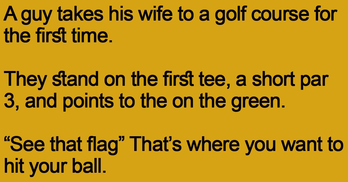 A guy takes his wife to a golf course for the first time. They stand on the first tee, a short par 3, and points to the on the green. … …
