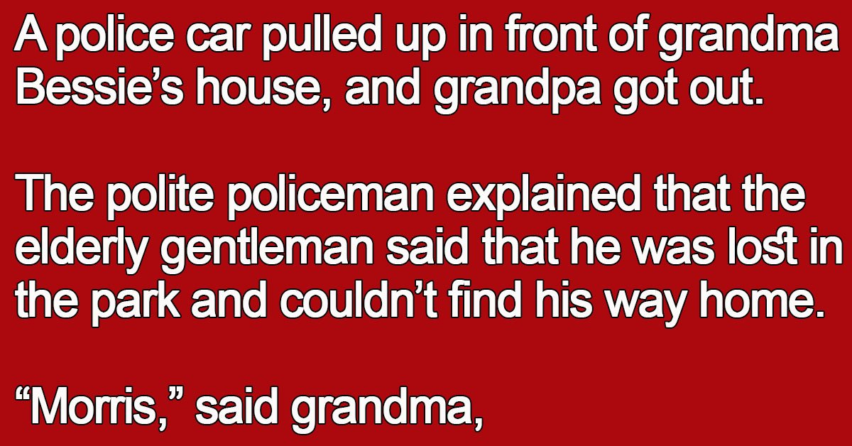 A police car pulled up in front of grandma Bessie’s house, and grandpa got out. The polite policeman explained that the elderly gentleman said that he was lost in the … …