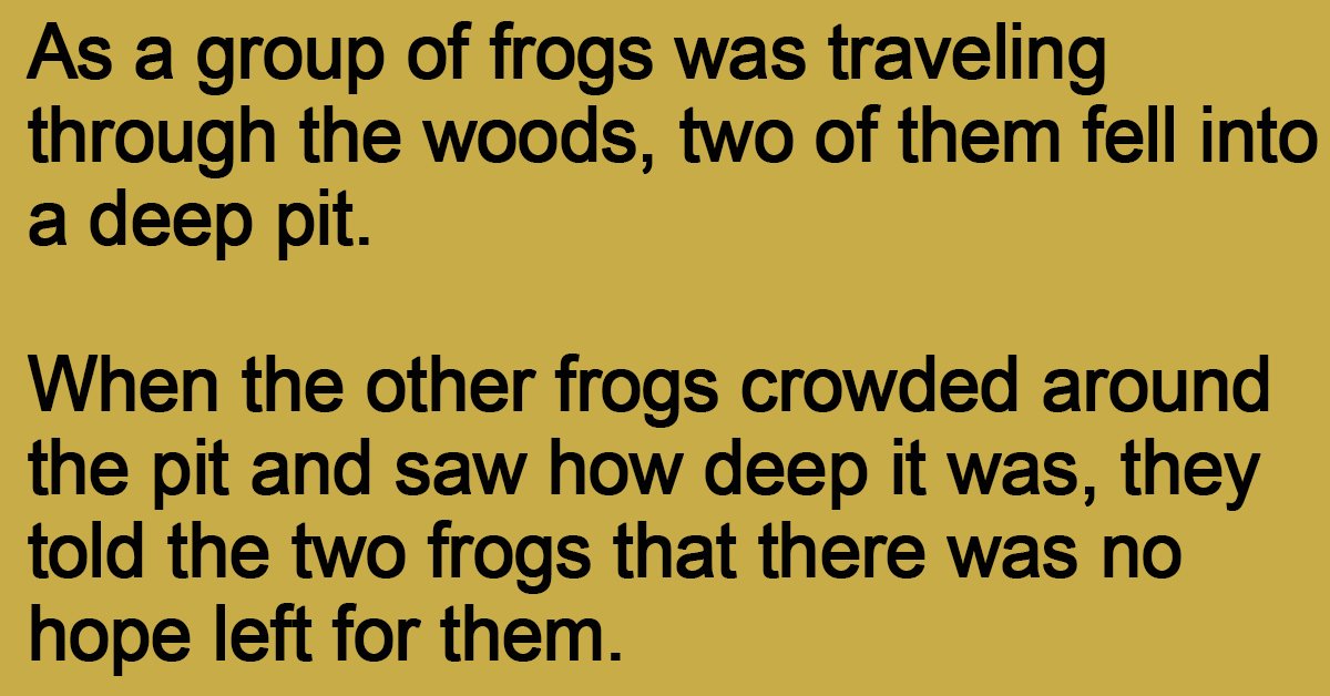 As a group of frogs was traveling through the woods, two of them fell into a deep pit. When the other frogs crowded around the pit and saw how deep … …