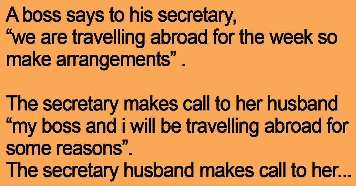 A boss says to his secretary “we are travelling abroad for the week so make arrangements” . The secretary makes call to her husband “my boss and i will be … …