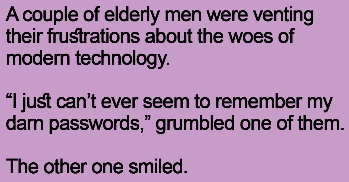 A couple of elderly men were venting their frustrations about the woes of modern technology. “I just can’t ever seem to remember my darn passwords,” grumbled one of them. The … …