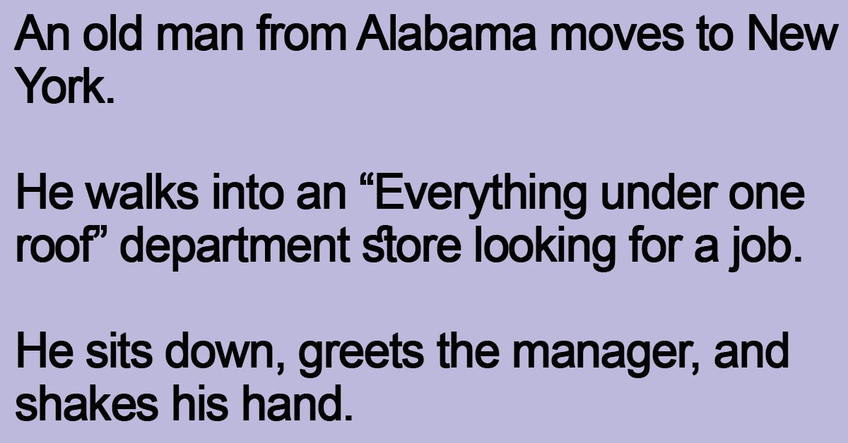 An old man from Alabama moves to New York. He walks into an “Everything under one roof” department store looking for a job. He sits down, greets the manager, and … …