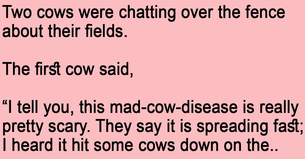 Two cows were chatting over the fence about their fields. The first cow said, “I tell you, this mad-cow-disease is really pretty scary. They say it is spreading fast; I … …