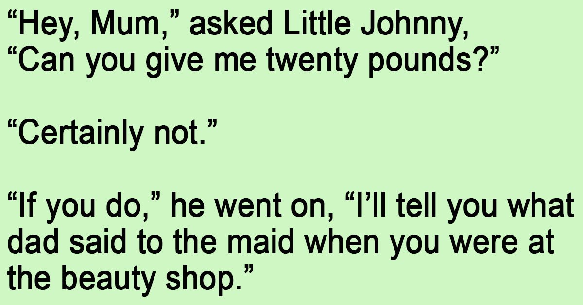 “Hey, Mum,” asked Little Johnny, “Can you give me twenty pounds?” “Certainly not.” “If you do,” he went on, “I’ll tell you what dad said to the maid when you … …