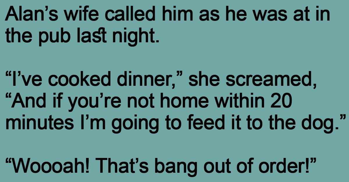 Alan’s wife called him as he was at in the pub last night. “I’ve cooked dinner,” she screamed, “And if you’re not home within 20 minutes I’m going to feed … …