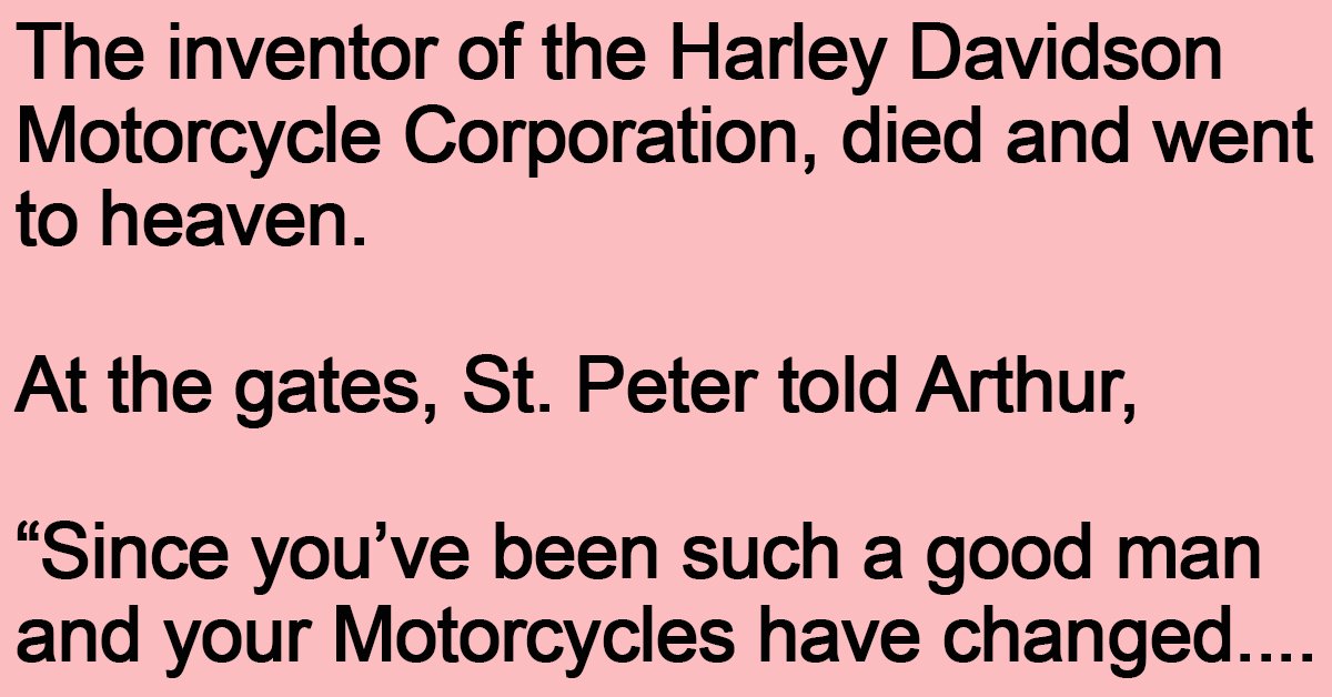The inventor of the Harley Davidson Motorcycle Corporation, died and went to heaven. At the gates, St. Peter told Arthur, “Since you’ve been such a good man and your Motorcycles … …