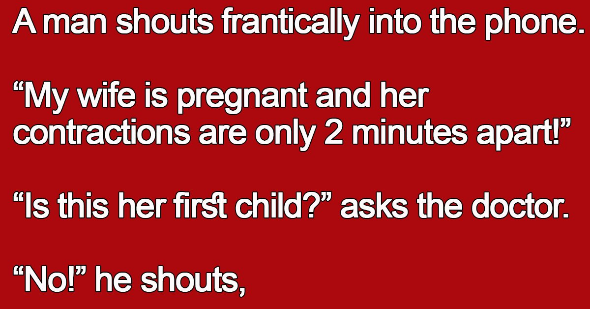 A man shouts frantically into the phone “My wife is pregnant and her contractions are only 2 minutes apart!” “Is this her first child?” asks the doctor. “No!” he shouts, … …