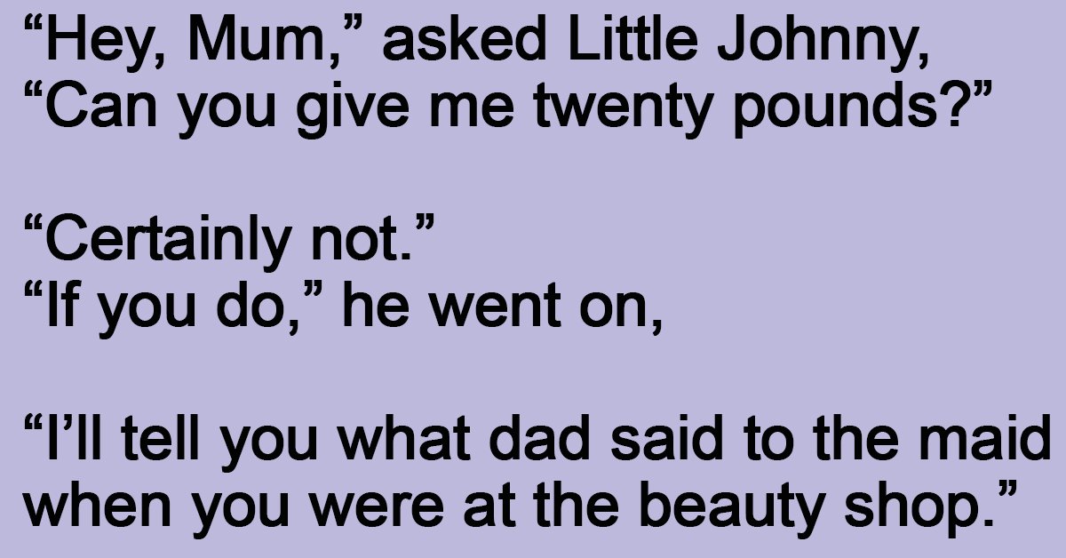 “Hey, Mum,” asked Little Johnny, “Can you give me twenty pounds?” “Certainly not.” “If you do,” he went on, “I’ll tell you what dad said to the maid when you … …