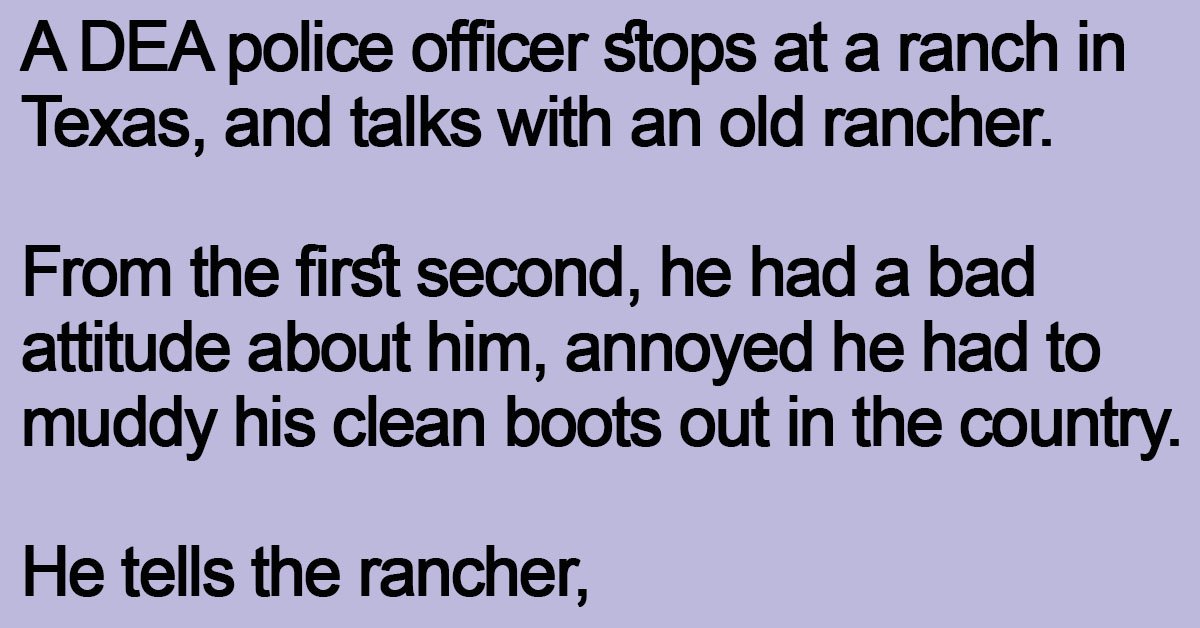 A DEA police officer stops at a ranch in Texas, and talks with an old rancher. From the first second, he had a bad attitude about him, annoyed he had … …