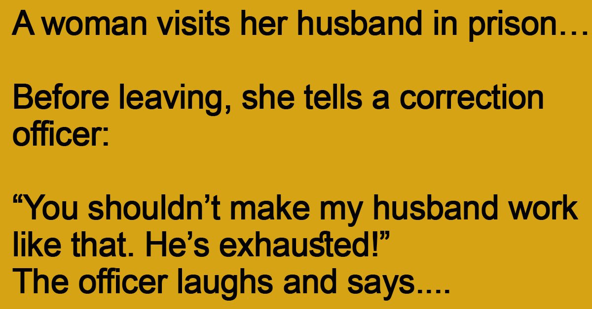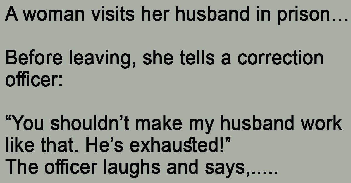 A woman visits her husband in prison… Before leaving, she tells a correction officer: “You shouldn’t make my husband work like that. He’s exhausted!” The officer laughs and says, “Are … …