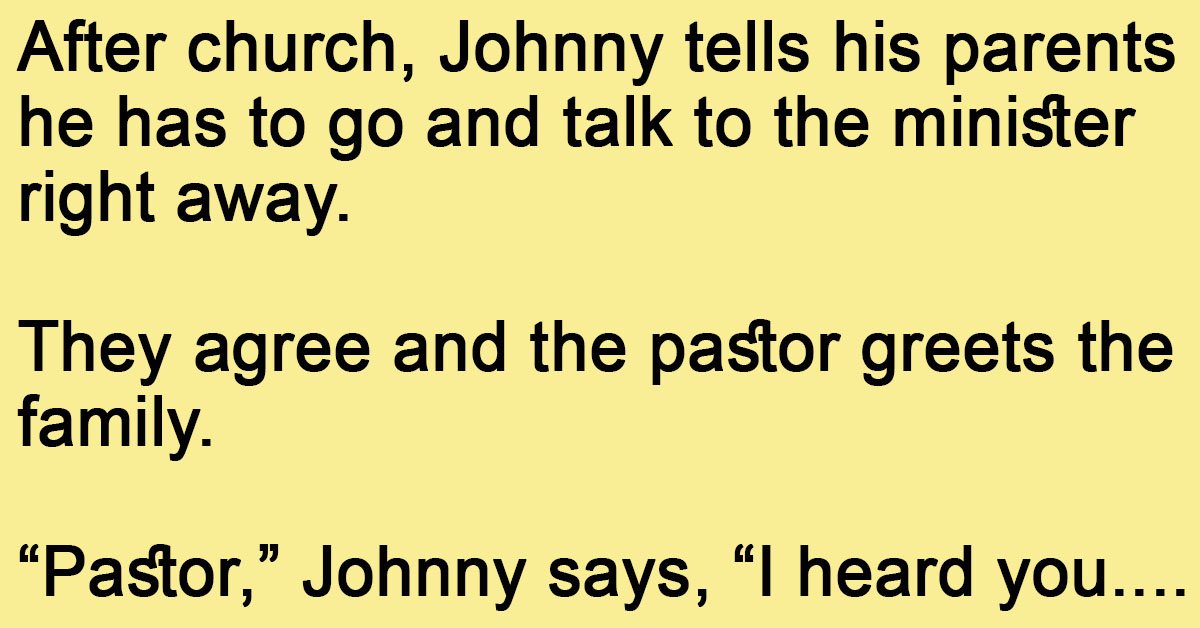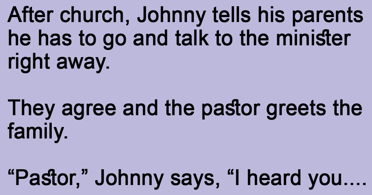 After church, Johnny tells his parents he has to go and talk to the minister right away. They agree and the pastor greets the family. “Pastor,” Johnny says, “I heard … …