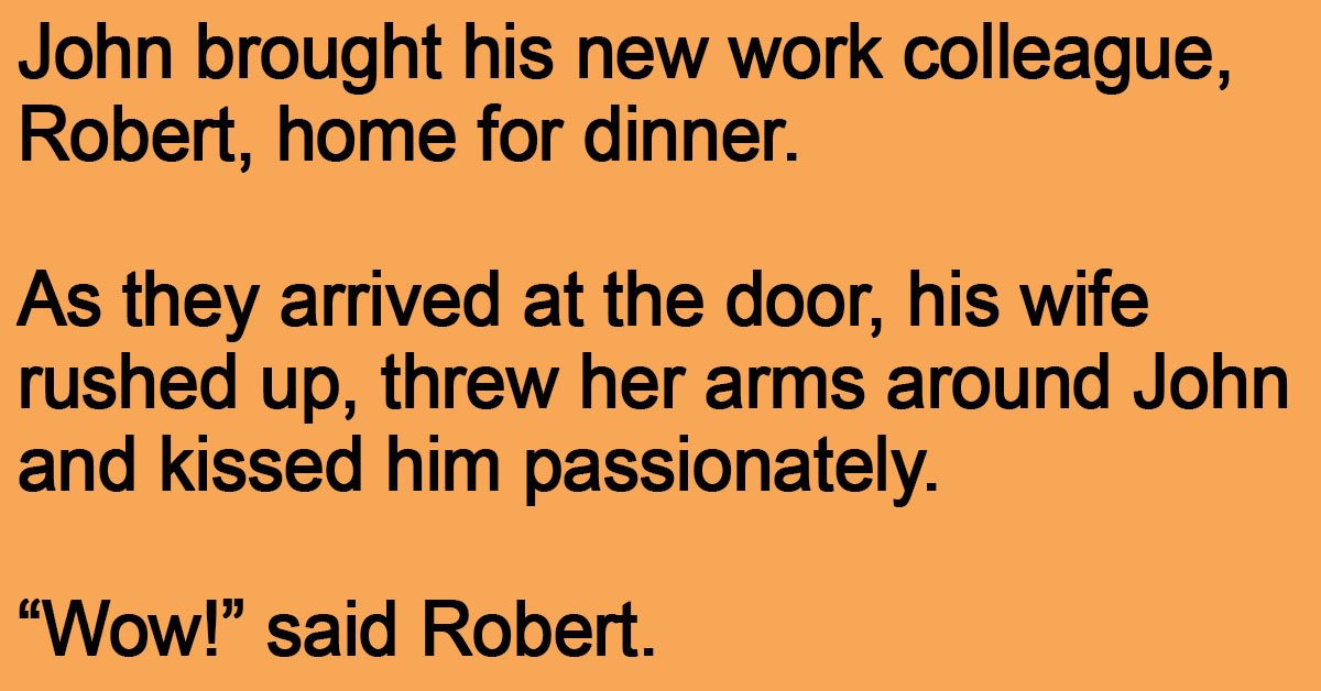 John brought his new work colleague, Robert, home for dinner. As they arrived at the door, his wife rushed up, threw her arms around John and kissed him passionately. “Wow!” … …
