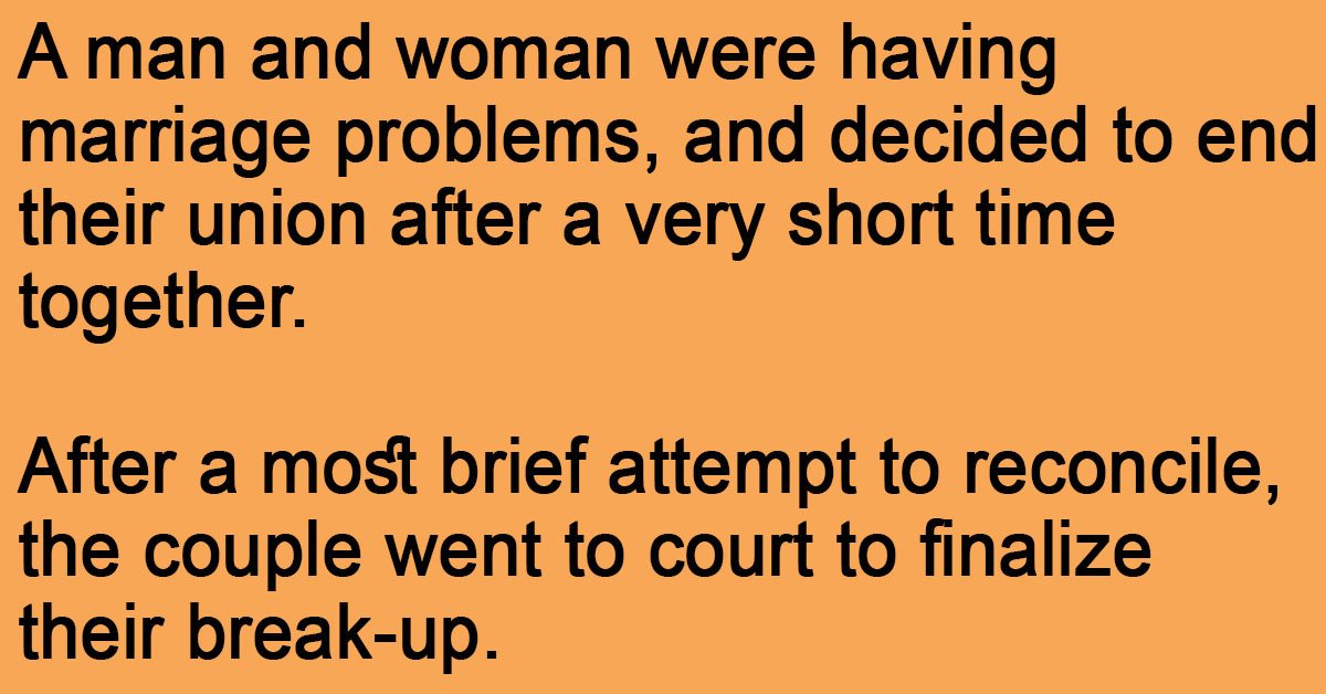 A man and woman were having marriage problems, and decided to end their union after a very short time together. After a most brief attempt to reconcile, the couple went … …