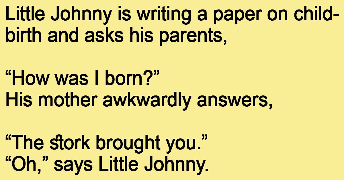Little Johnny is writing a paper on childbirth and asks his parents, “How was I born?” His mother awkwardly answers, “The stork brought you.” “Oh,” says Little Johnny. “Well, how … …