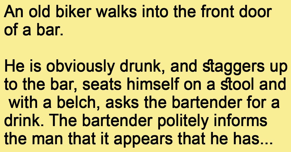 An old biker walks into the front door of a bar. He is obviously drunk, and staggers up to the bar, seats himself on a stool and, with a belch, … …