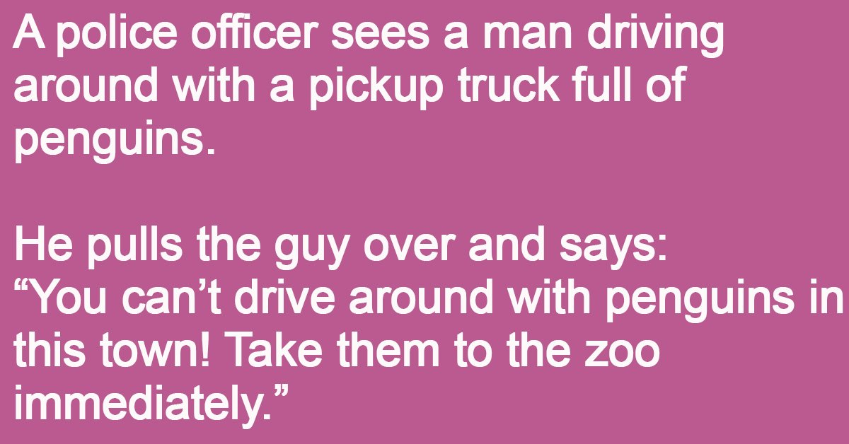 A police officer sees a man driving around with a pickup truck full of penguins. He pulls the guy over and says: “You can’t drive around with penguins in … …