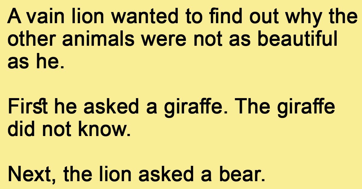 A vain lion wanted to find out why the other animals were not as beautiful as he. First he asked a giraffe. The giraffe did not know. Next, the lion … …