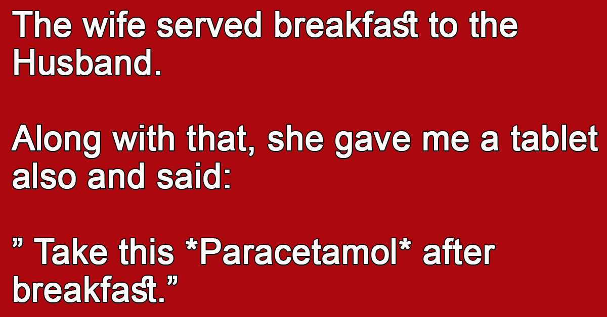 The wife served breakfast to the Husband. Along with that, she gave me a tablet also and said: ” Take this *Paracetamol* after breakfast.” Husband: ” Why? I don’t have … …