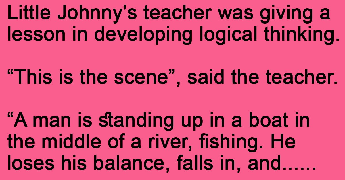 Little Johnny’s teacher was giving a lesson in developing logical thinking. “This is the scene”, said the teacher. “A man is standing up in a boat in the middle of … …
