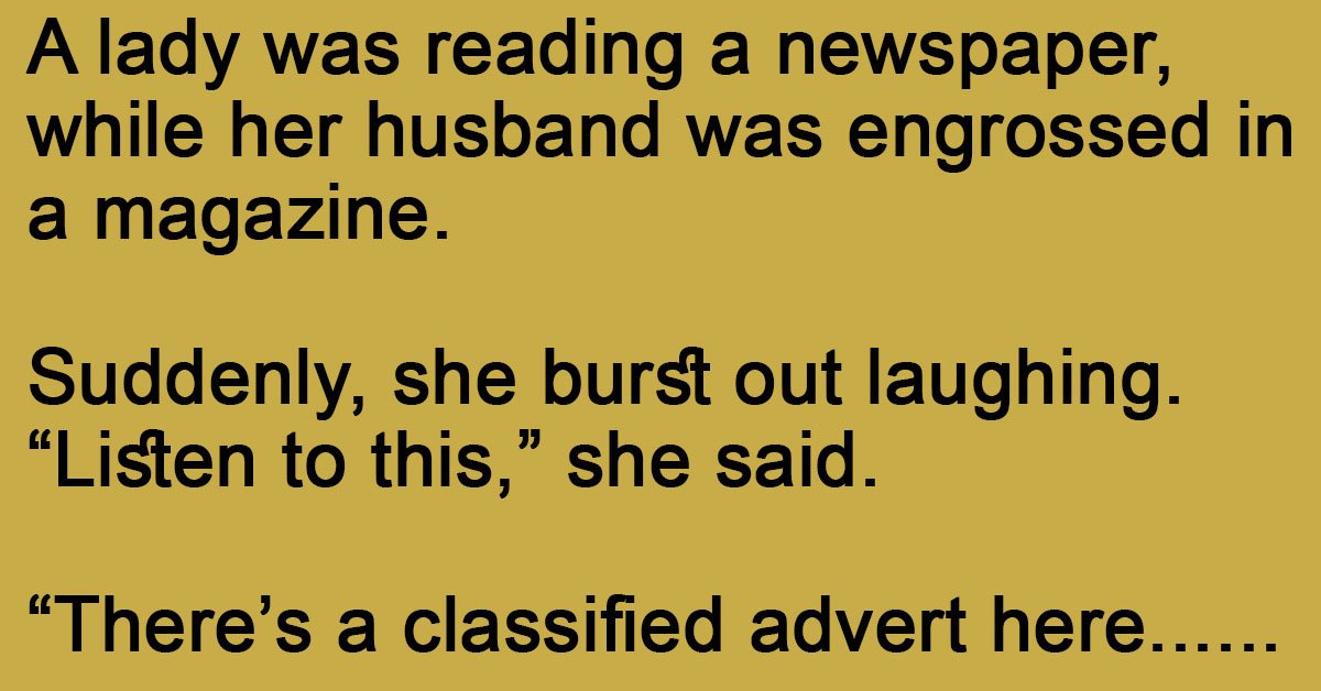 A lady was reading a newspaper, while her husband was engrossed in a magazine. Suddenly, she burst out laughing. “Listen to this,” she said. “There’s a classified advert here where … …