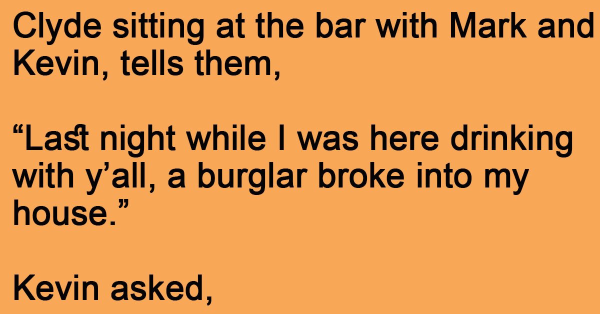 Clyde sitting at the bar with Mark and Kevin, tells them, “Last night while I was here drinking with y’all, a burglar broke into my house.” Kevin asked, “Did he … …