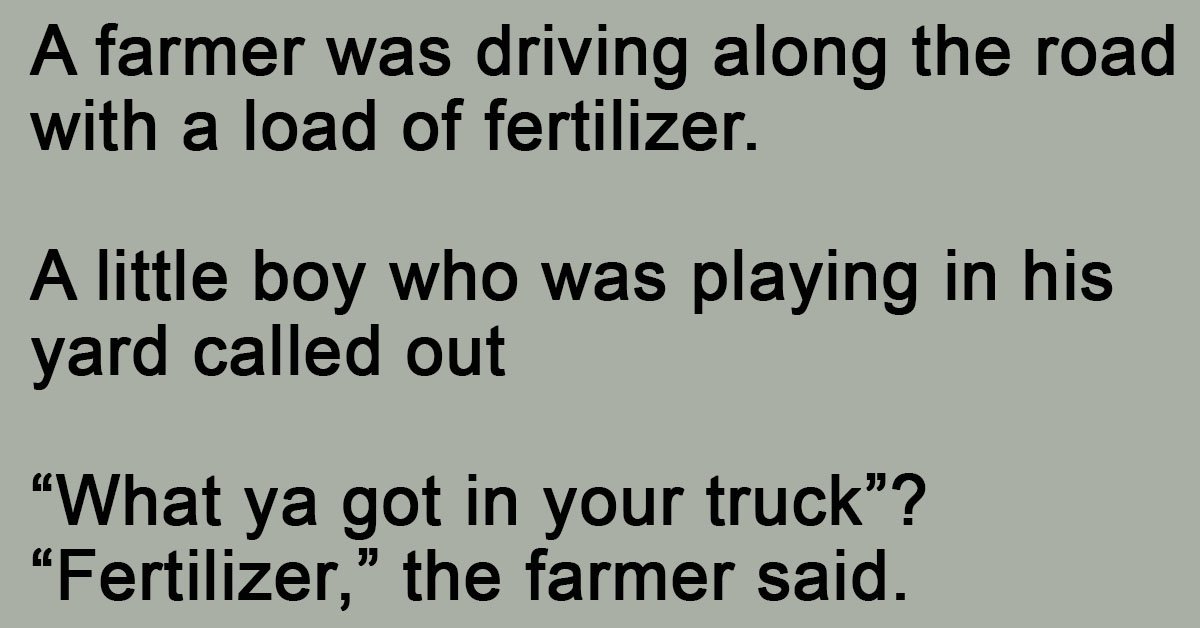 A farmer was driving along the road with a load of fertilizer. A little boy who was playing in his yard called out “What ya got in your truck”? “Fertilizer,” … …