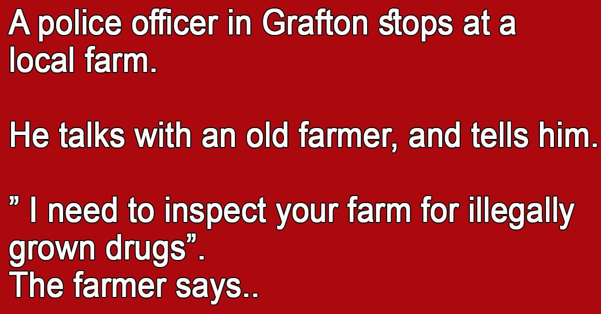 A police officer in Grafton stops at a local farm. He talks with an old farmer, and tells him. ” I need to inspect your farm for illegally grown drugs”. … …
