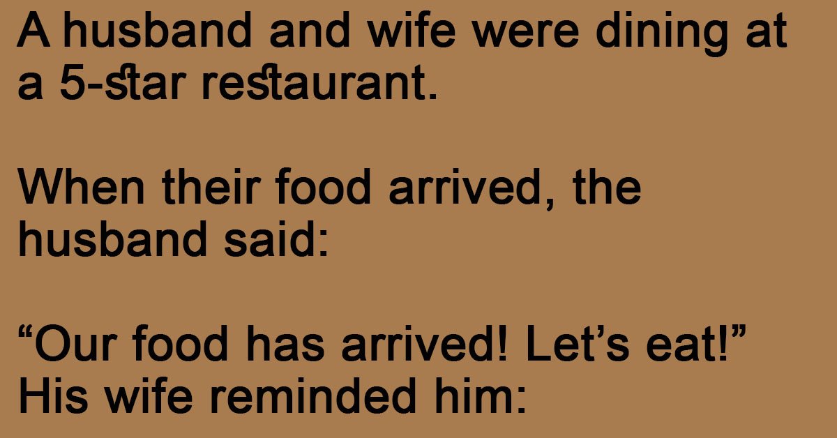 A husband and wife were dining at a 5-star restaurant. When their food arrived, the husband said: “Our food has arrived! Let’s eat!” His wife reminded him: “Honey, you always … …